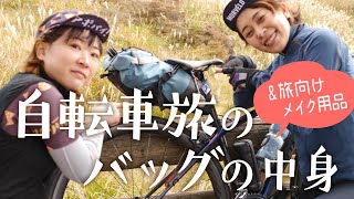 かなりの容量が入るので、夏場なら着替え1セット、化粧ポーチ、散策用の靴や輪行袋も入ります。